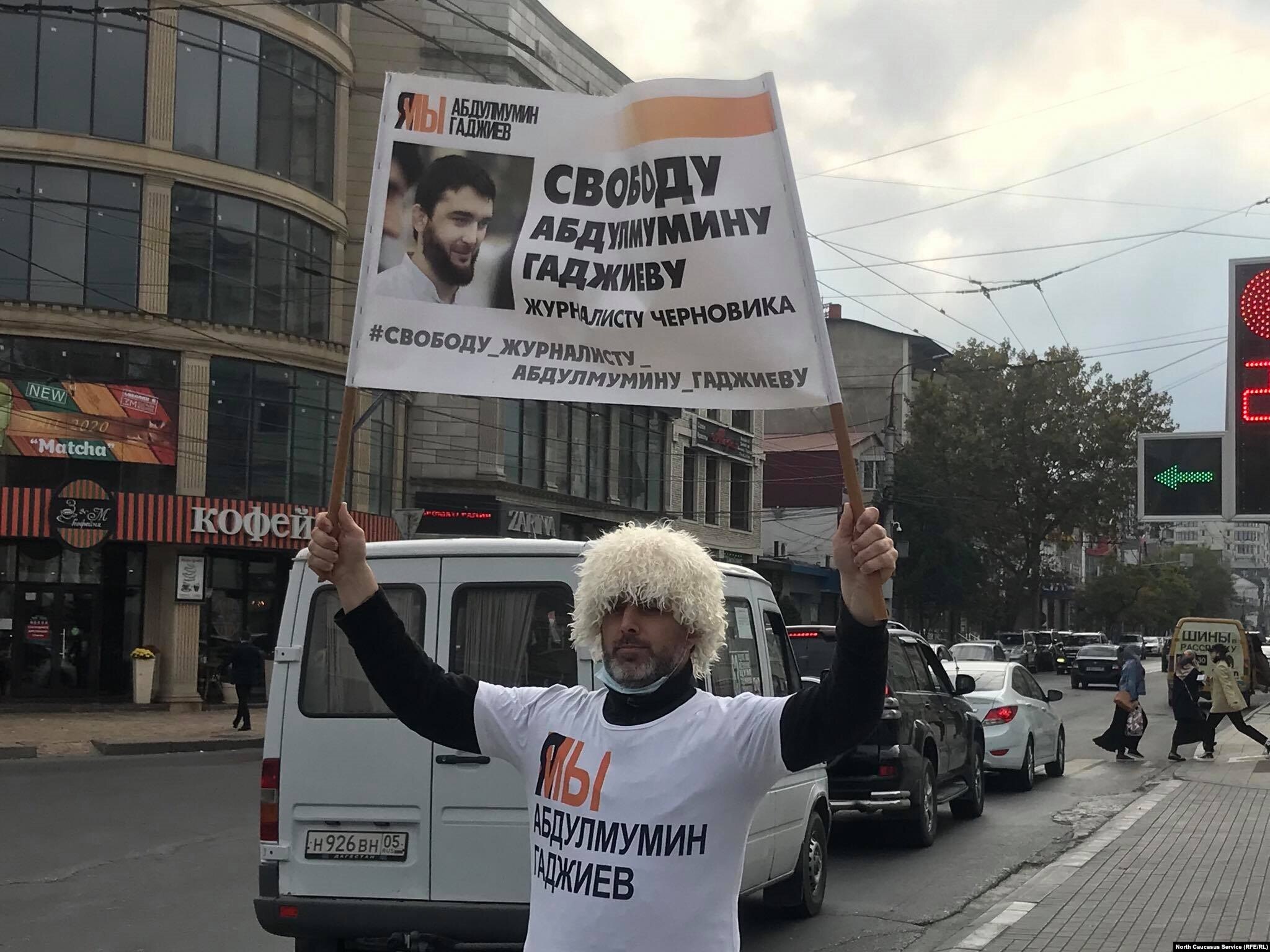 В Махачкале прошла серия одиночных пикетов с требованием прекратить аресты без доказательств и освободить журналиста Абдулмумина Гаджиева, обвиняемого в финансировании терроризма.