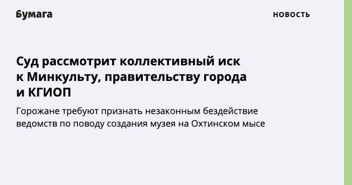 Истцы требуют признать незаконными бездействие Минкульта, правительства Петербурга и КГИОП в части выполнения поручения Владимира Путина и обязать чиновников разработать предложения о создании историко-археологического музея-заповедника на Охтинском мысе.