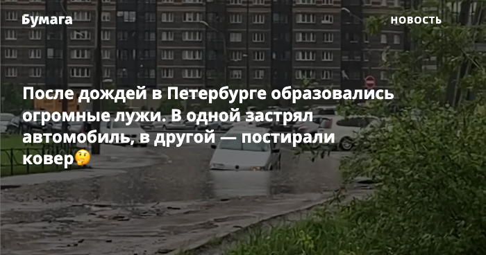 После дождей в Петербурге образовались огромные лужи. В одной из них застрял автомобиль, а в другой постирали ковер. Об этом сообщили очевидцы в группе «Признавашки ДТП и ЧП Санкт-Петербург».