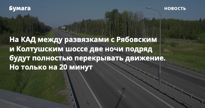 В ночь с 26 на 27 мая и с 27 на 28 мая на КАД между развязками с Рябовским и Колтушским шоссе полностью перекроют движение. Но только на 20 минут — с 00:00 до 00:20. Об этом «Бумаге» сообщили в пресс-службе ФКУ Упрдор «Северо-Запад».
