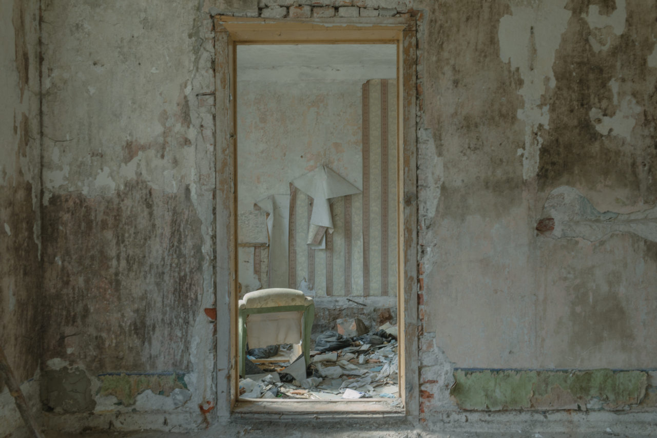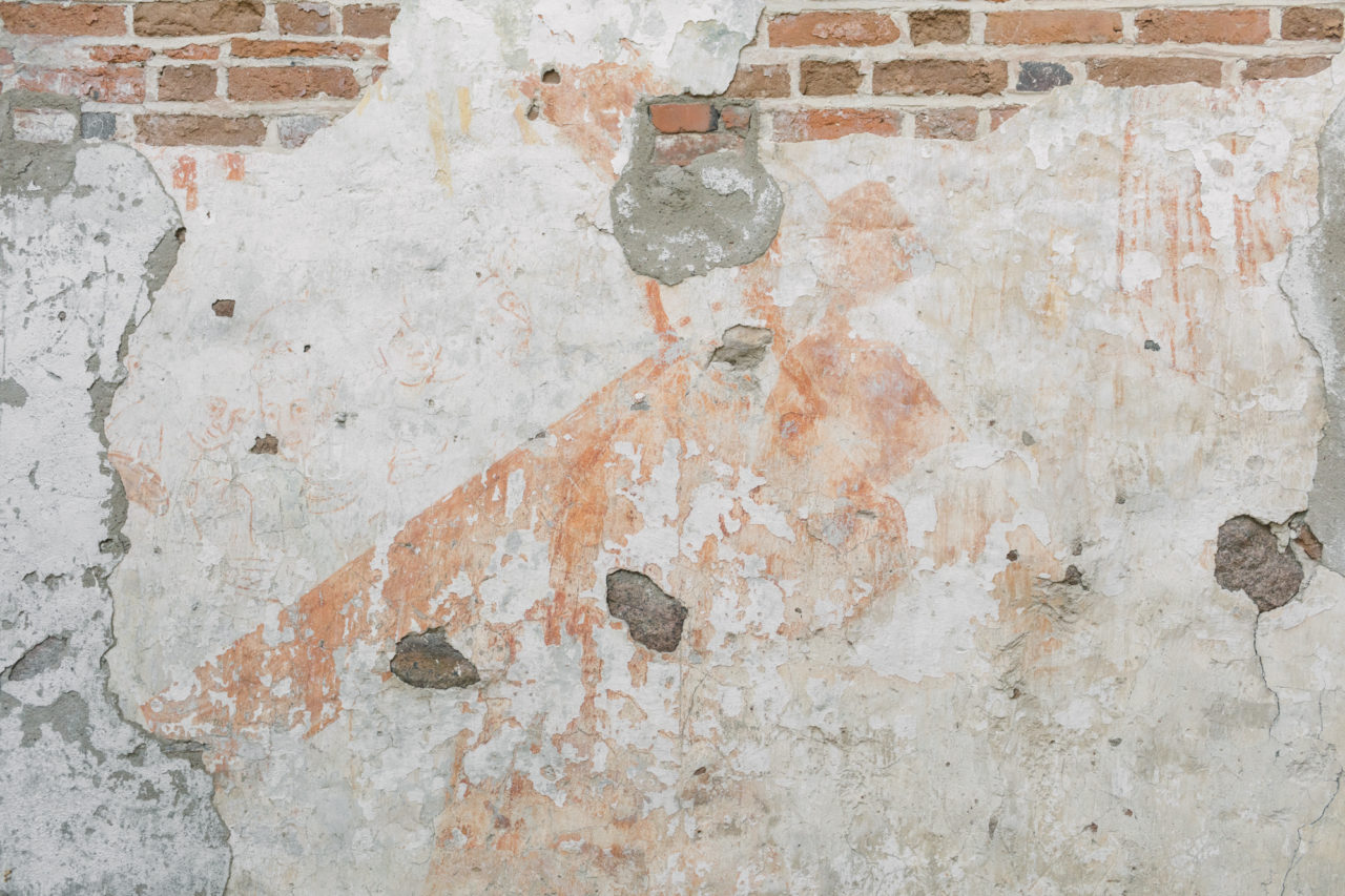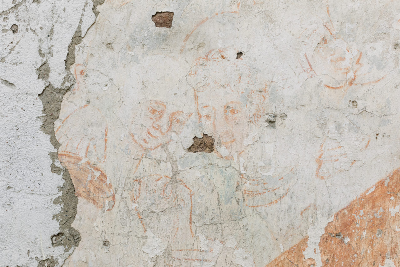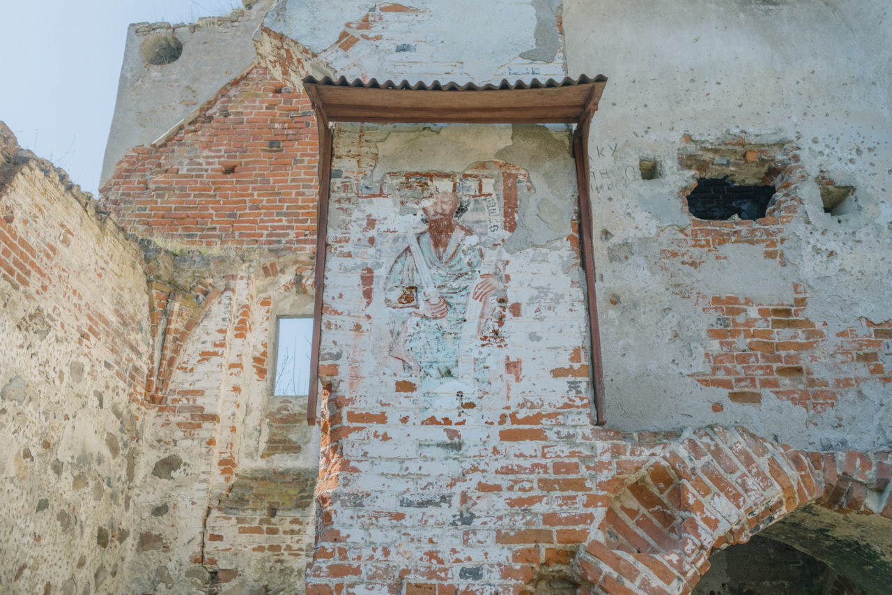Интерьер бывшего дома пастора у кирхи в ХрабровеФото: Ксения Иванова для ТД Ущерб, нанесенный кирхе мародерами, оценить невозможно, но, лишенная крыши, она разрушалась и сама по себе. В начале нулевых от одной из внутренних стен отвалился слой штукатурки, нанесенной, по всей видимости, во времена Реформации, обнажив средневековую фреску. Фреска видна до сих пор, на ней — печальный апостол Павел с мечом, но без одного глаза. Его написал неизвестный автор в XIV веке, и это одна из старейших сохранившихся фресок региона. Вся забота о ней со стороны властей выразилась в установке над изображением железного козырька, который не спасает фреску от стремительного разрушения.