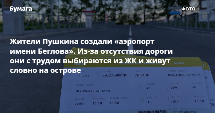 Жители ЖК «Александровский» в Пушкине создали «аэропорт имени Беглова», чтобы привлечь внимание властей к отсутствию дороги. Об этом сообщили в паблике жилого комплекса.