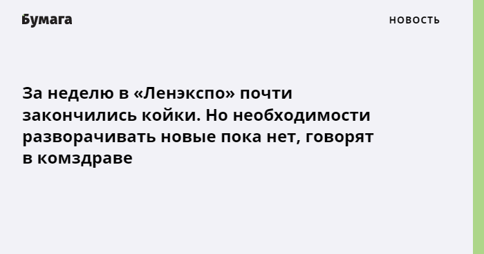 Как сообщили «Бумаге» в комитете по здравоохранению, в «Ленэкспо» занято 89 коек, в том числе три реанимационные. «Говорить о том, что в „Ленэкспо“ закончились койки, некорректно», — добавили в комитете.