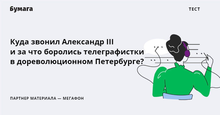Вместе с создательницей сообщества «Факультатив по истории» Ольгой Андреевой и МегаФоном «Бумага» подготовила тест о связи (и ее отсутствии) в дореволюционном Петербурге. Проверьте, разбираетесь ли вы, как в те годы была организована коммуникация, и узнайте, чем могли бы закончиться некоторые исторические события, если бы тогда существовали мобильные телефоны и интернет.