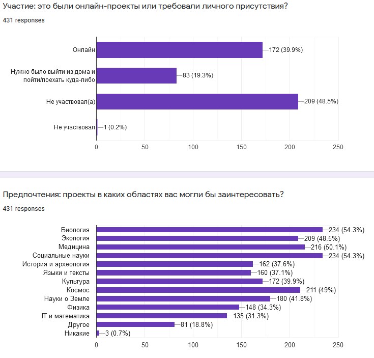 В 2020 году Институт статистических исследований и экономики знаний Высшей школы экономики провел опрос россиян о вовлеченности в гражданскую науку. Лишь 3% респондентов имели опыт в научной активности. Большинство из них живут в областных центрах, где, как правило, есть университеты. Каждый второй имеет законченное высшее образование.