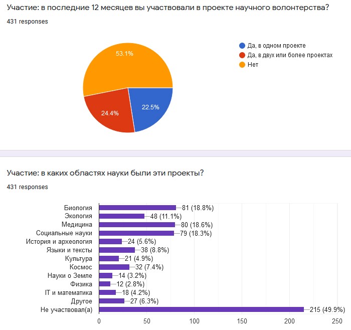 Результаты опроса волонтеров портала «Люди науки»Фото: «Люди науки» Истории наших героев могут навести на мысль, что научный волонтер — это тот, кто непременно выполняет исследовательскую работу: каталогизирует документы, спускается в логово летучих мышей, бежит многокилометровый кросс по байкальскому побережью за чирком-трескунком… Это не совсем так.