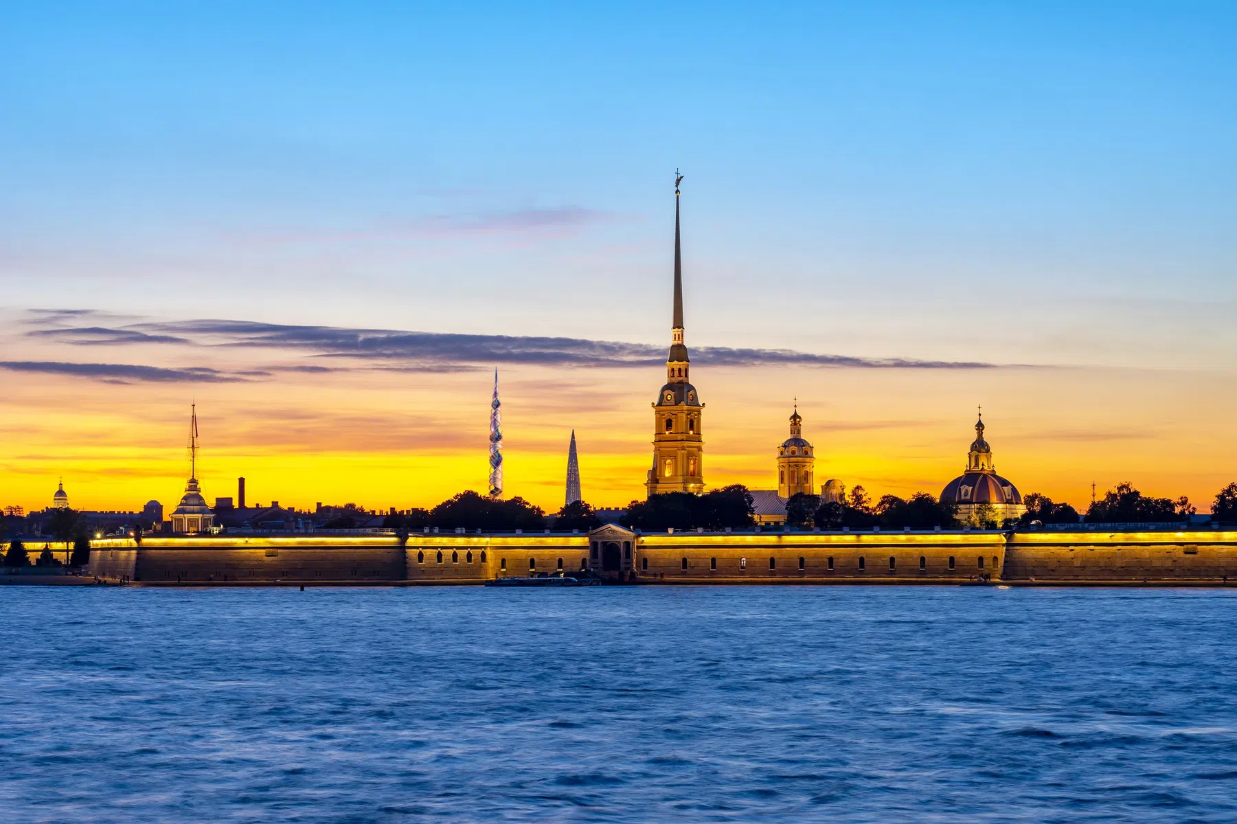 Тогда, помнится, нам врали, что он якобы «не будет виден из центра города», потому что находится от него в 9 километрах. Но в хорошую погоду он прекрасно виден с Дворцовой набережной на фоне Стрелки Васильевского острова и Петропавловской крепости.
