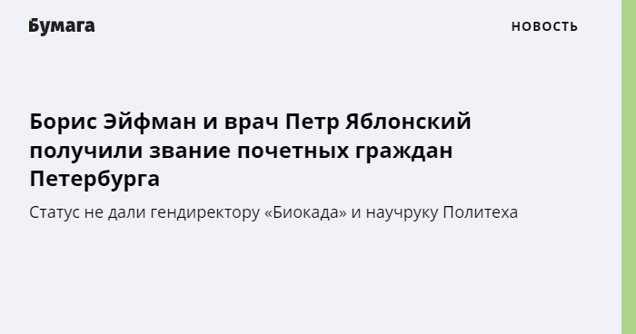 В этом году почетные граждане Петербурга выбирались из четырех кандидатов. Помимо Эйфмана и Яблонского на получение звания также претендовали гендиректор «Биокада» Дмитрий Морозов и научный руководитель Политехнического университета Юрий Васильев.