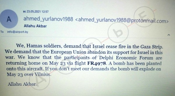 В 12:25 такое же письмо c адреса ahmed_yurlanov1988@protonmail.com получила администрация "Литовских аэропортов". Как удалось выяснить "Досье", на момент, когда диспетчер говорил пилотам о том, что угрозы получили сразу несколько аэропортов, в действительности письмо пришло только "Литовским аэропортам" - в частности, в афинский аэропорт, откуда самолет вылетел, такое послание не приходило.