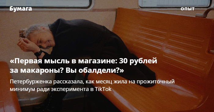 Видео хорошо заходили, но меня тревожила бесполезность контента. Не покидала мысль, что нужно делать что-то важное, социальное. Поэтому я решилась на эксперимент — прожить месяц на прожиточный минимум. Взяла средний показатель по Питеру — 11 910 рублей.