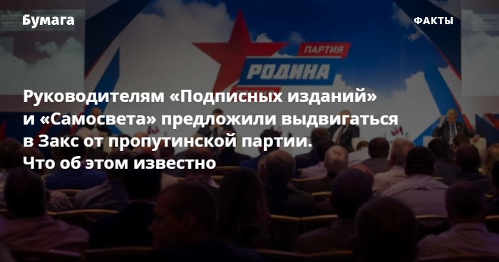 Петербургские предприниматели получают предложения идти на выборы в Закс от пропутинской партии «Родина», созданной главой «Роскосмоса» Дмитрием Рогозиным. Представители партии связывались, например, с руководителями «Подписных изданий» и «Самосвета», которые не имеют отношения к «Родине» и отказались от предложения.