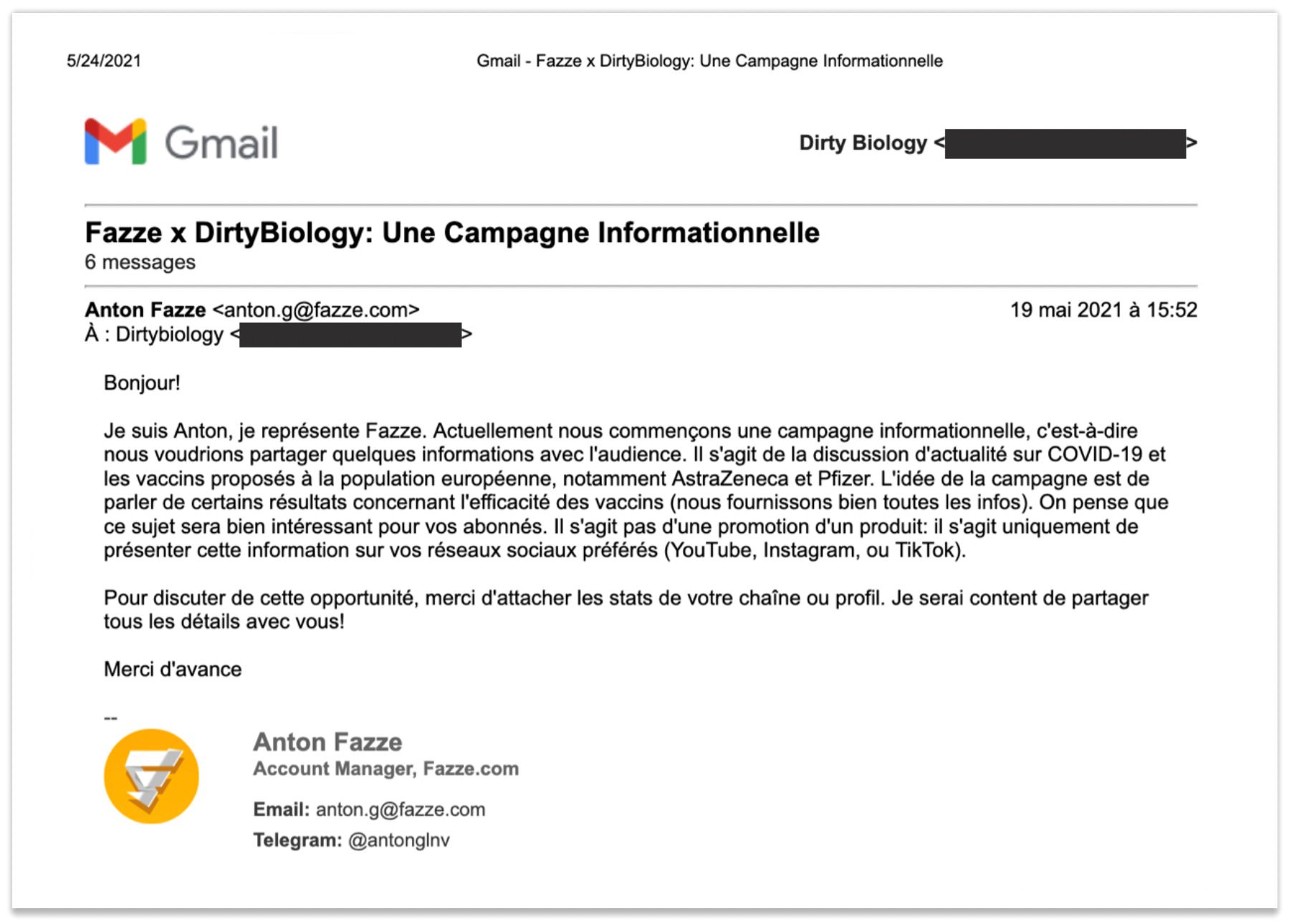 19 мая 2021 года французский блогер и популяризатор науки Лео Грассе, ведущий ютьюб-канала Dirty Biology, получил имейл от представителя рекламного агентства, который предложил разместить на каналах блогера в ютьюбе, тиктоке или инстаграме нативный материал по техзаданию, которое прилагалось к письму. «Речь не идет о рекламе продукта, — уточнил автор письма, — нужно просто представить эту информацию в ваших любимых социальных сетях». Из дальнейшей переписки, которой Грассе поделился с «Медузой», ясно, что «интересная информация» касается вакцин от коронавируса — и конкретно доступных европейцам Pfizer и AstraZeneca. Блогеру предлагали поделиться со своими подписчиками примерно минутным видео, содержащим несколько тезисов о том, что инъекции вакцины Pfizer в три раза чаще по сравнению с AstraZeneca приводят к смерти вакцинированных — а мейнстримные СМИ якобы скрывают эту информацию.