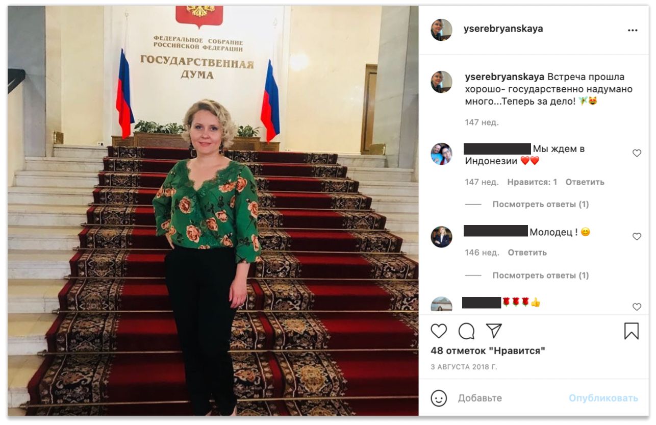 Это движение занимается самыми разными проектами — от юридической поддержки российских моряков, арестованных в 2019 году в Греции, до продвижения русского языка за рубежом и включения слова podvig в словари основных языков мира. А сама Юлия Серебрянская стремится в политику — она пыталась зарегистрироваться кандидатом-самовыдвиженцем на выборах в Мосгордуму в 2019 году, но не собрала нужного количества подписей.