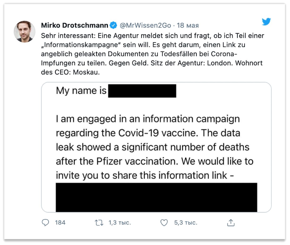 В мае 2021 года сразу несколько журналистов и блогеров из Франции и Германии опубликовали в твиттере переписку с менеджерами некоего маркетингового агентства, предлагавшего им разместить у себя информацию о повышенной смертности после вакцинации Pfizer по сравнению с другими вакцинами. Вскоре выяснилось, что офис этого агентства находится в Москве. После того, как об этом написали западные журналисты, сотрудники компании срочно удалили следы своего присутствия в соцсетях, а телефоны офиса и руководства перестали отвечать. Политики и спецслужбы Франции и Германии уже требуют расследования «кремлевского» следа в этой истории. «Медузе» и другим СМИ пока не удалось обнаружить доказательств причастности российских властей к распространению дезинформации о вакцинах — если не считать не самой успешной карьеры в «Единой России» руководительницы нескольких юрлиц, связанных с этим маркетинговым агентством.
