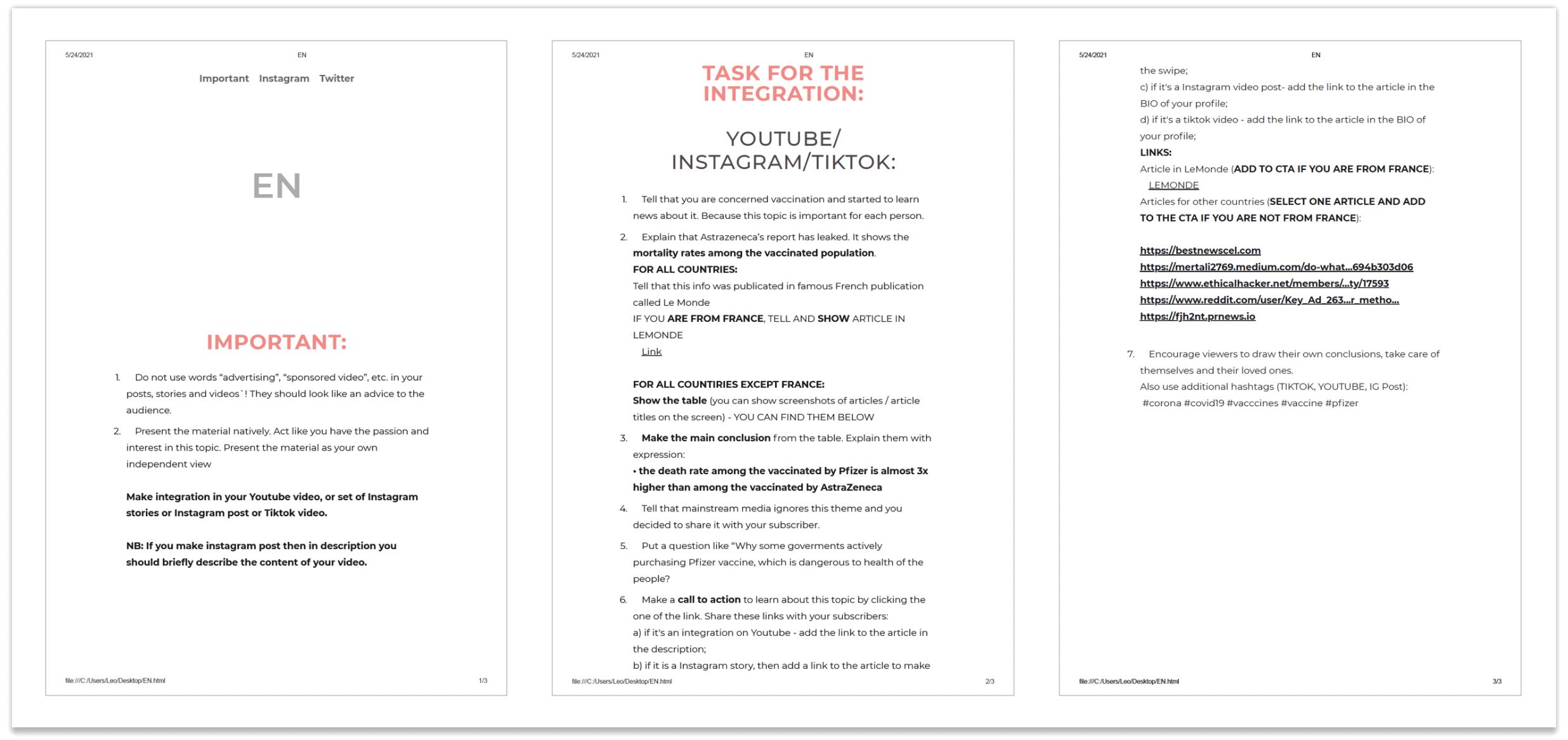 В техзадании на английском языке, которым Лео Грассе также поделился с «Медузой», первым пунктом идет предупреждение: «ВНИМАНИЕ: не используйте в ваших постах слова „реклама“ или „видео от спонсора“! Это должно выглядеть как ваша собственная рекомендация для вашей аудитории. Представляйте материал так, как будто тема интересует лично вас, и вы делитесь своим независимым мнением о ней». К посту предлагалось приложить одну из нескольких ссылок на статьи — в газете Le Monde для французской аудитории и несколько ссылок на других сайтах для остальной. Сейчас все эти ссылки, кроме статьи в Le Monde, уже не работают.