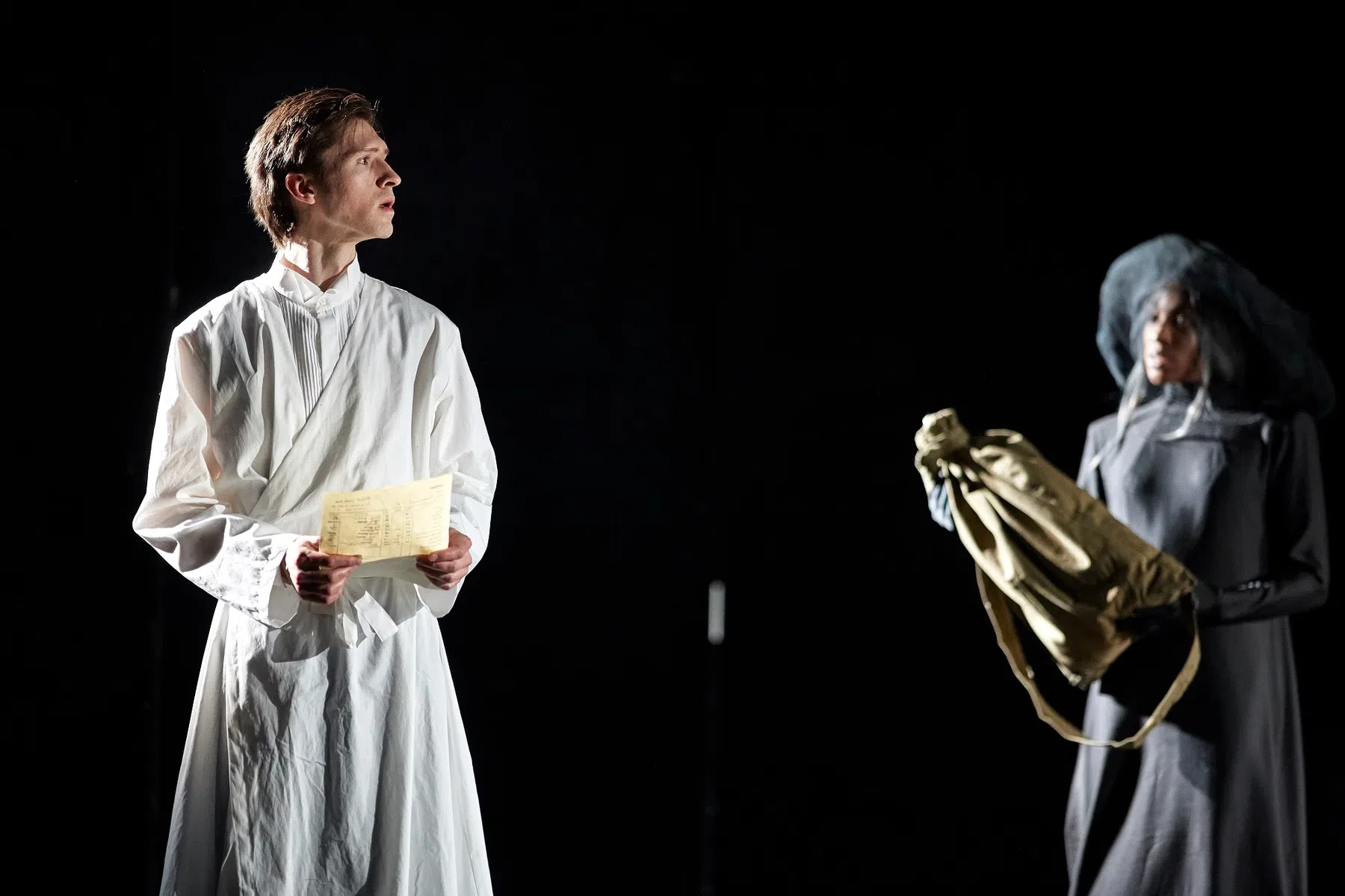 Выбор Ивана Вакуленко на заглавную роль оказался точным. Его сценическая манера лишена характерной определенности, яркости сценических переживаний. Ближайшее окружение Юрия Живаго — его друг Миша Гордон (Вениамин Краснянский), его дядя Николай Веденяпин (Никита Тюнин), его брат Евграф (Рифат Аляутдинов) — играется и ярче, и крупнее по характеристикам. Но по мере развертывания действия обнаруживается, как глубоко артист прочувствовал и впитал «строки судьбы» своего героя, как тонко осознал поэтические смыслы образа. Вакуленко не столько играет характер героя, сколько несет тему романа и делает это всем своим существом. Веришь, что висящая в воздухе тетрадка стихов заполнена его почерком. Читают их другие, читают вдумчиво, с большой точностью смыслов. Но все-таки написал эти «стихи из романа» именно он, такой непоказной и навсегда одинокий.