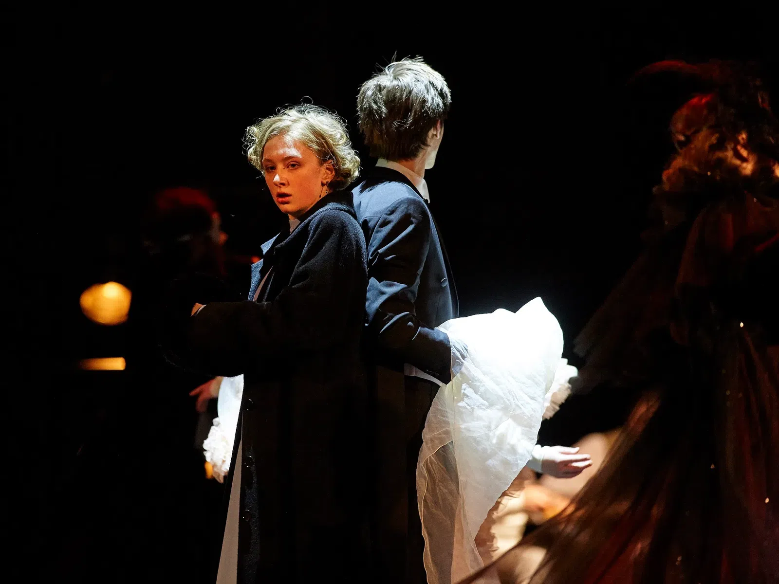 Смерть в этом спектакле — не «белая нежить» из фольклора и не «казенная землемерша» из романа, но чернокожая красавица в шляпе с траурными перьями, своего рода «негатив» таинственной блоковской Незнакомки. Стефания — Елизавета Бурмакова играет эту роль без привкуса метафизики. Она является на сцену, когда кому-то из героев пришла пора уходить из жизни, а с заглавным героем почти не расстается. Так близко она «совпадает» с основной темой его жизни, с главным мотивом его стихов, а в конечном счете с основным посылом спектакля: религиозное преодоление смерти «усильем Воскресенья» и поэтическое обретение бессмертия в творчестве.