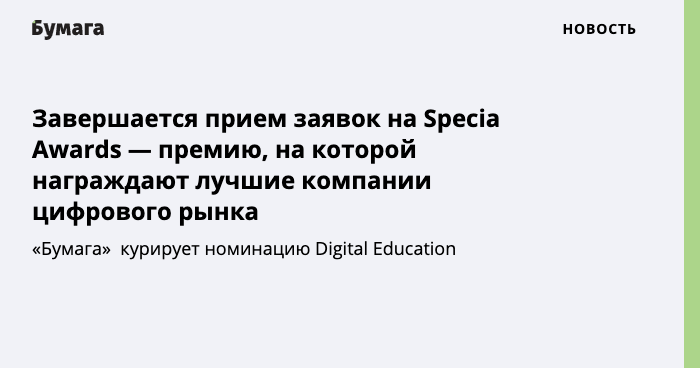 В Петербурге завершается прием заявок на премию Specia Awards — 2021. Это ежегодное событие, на котором награждают лучшие компании городского цифрового рынка. Об этом «Бумаге» сообщили в пресс-службе премии.
