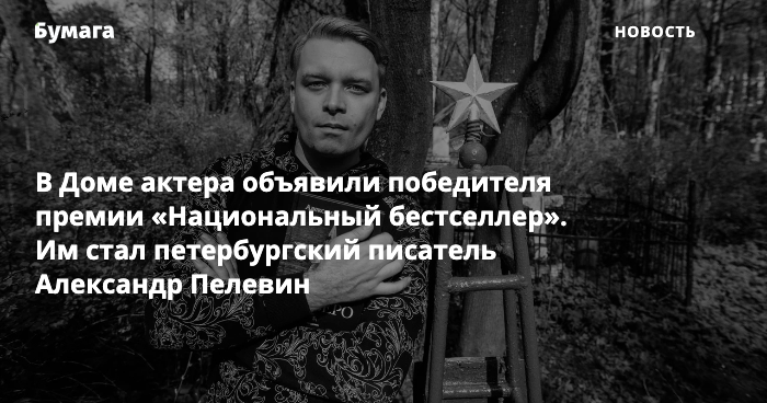 В Доме актера 29 мая объявили победителя премии «Национальный бестселлер». Им стал петербургский писатель Александр Пелевин с работой «Покров-17». Об этом сообщают в телеграм-канале книжного магазина «Все свободны».