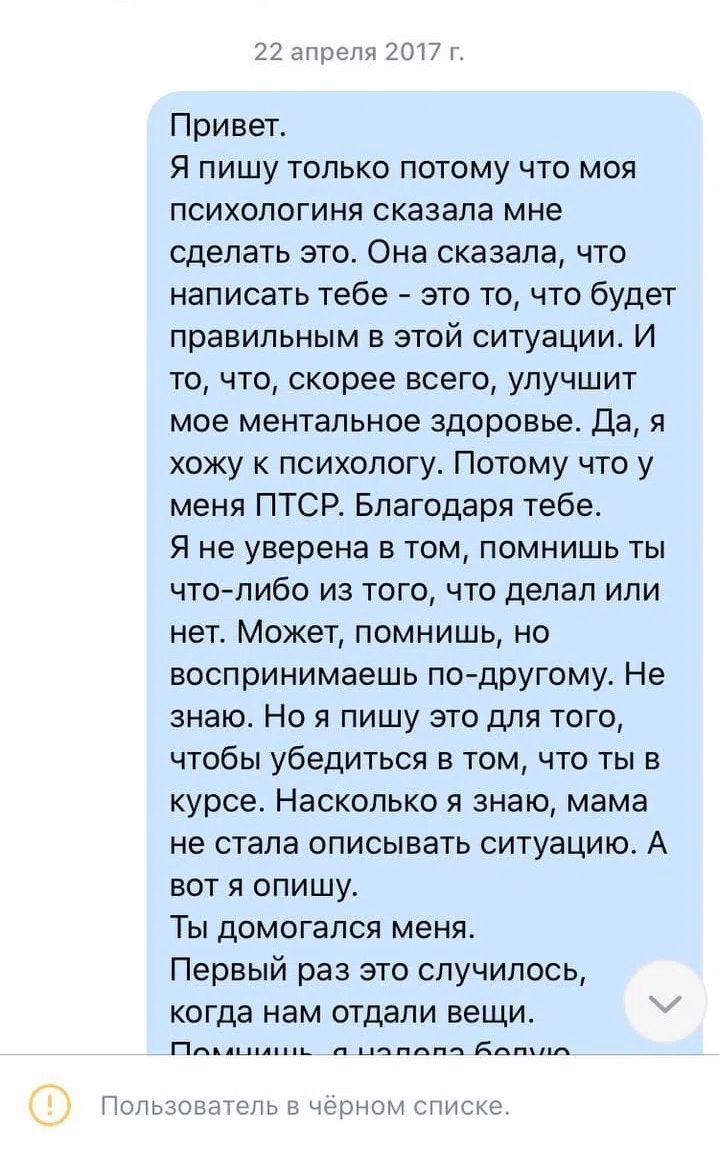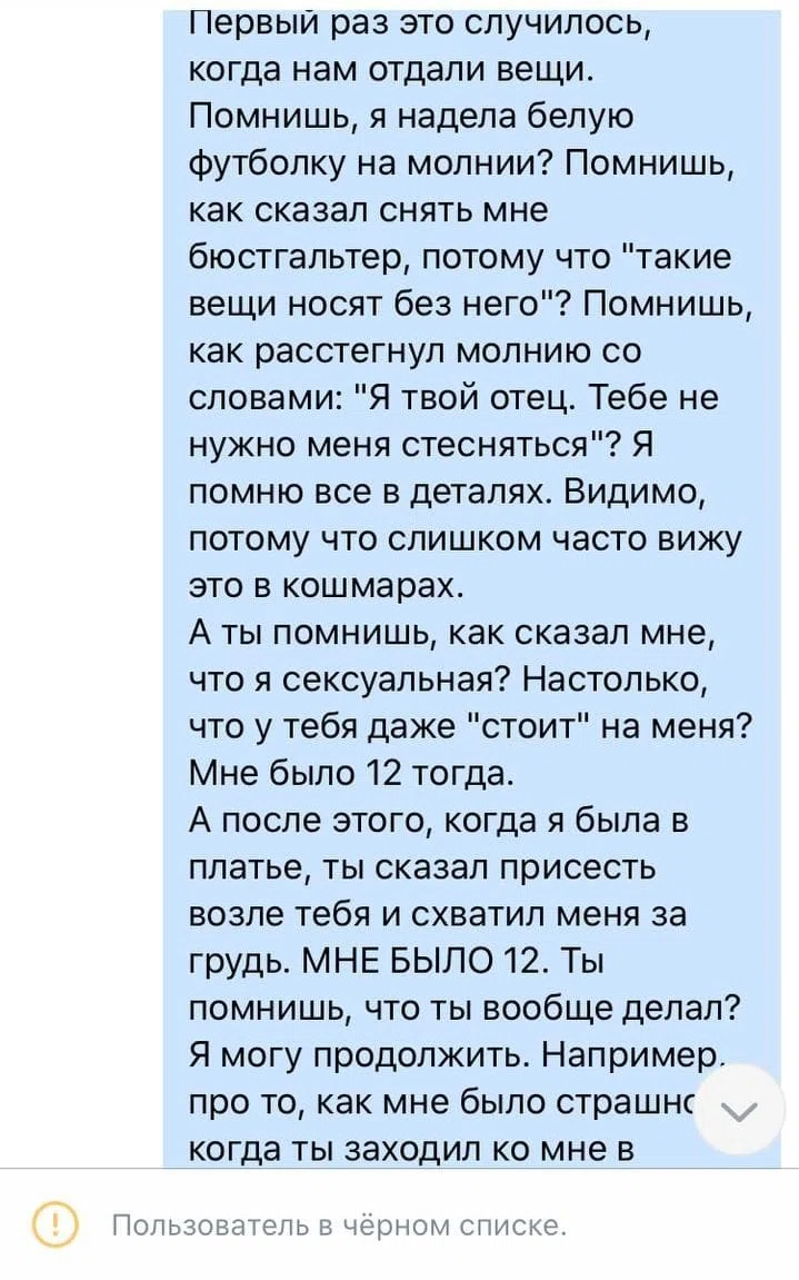 Я с ним связывалась после всего произошедшего один раз, по совету психологини. Я написала огромное сообщение: «Наверное, ты этого не помнишь, но ты меня насиловал. Теперь у меня шрамы, ПТСР, кошмары, я не могу жить нормальной жизнью и никогда не буду. Я очень злюсь, что ты живешь, а я не могу жить. Я тебя ненавижу». И отправила ему.