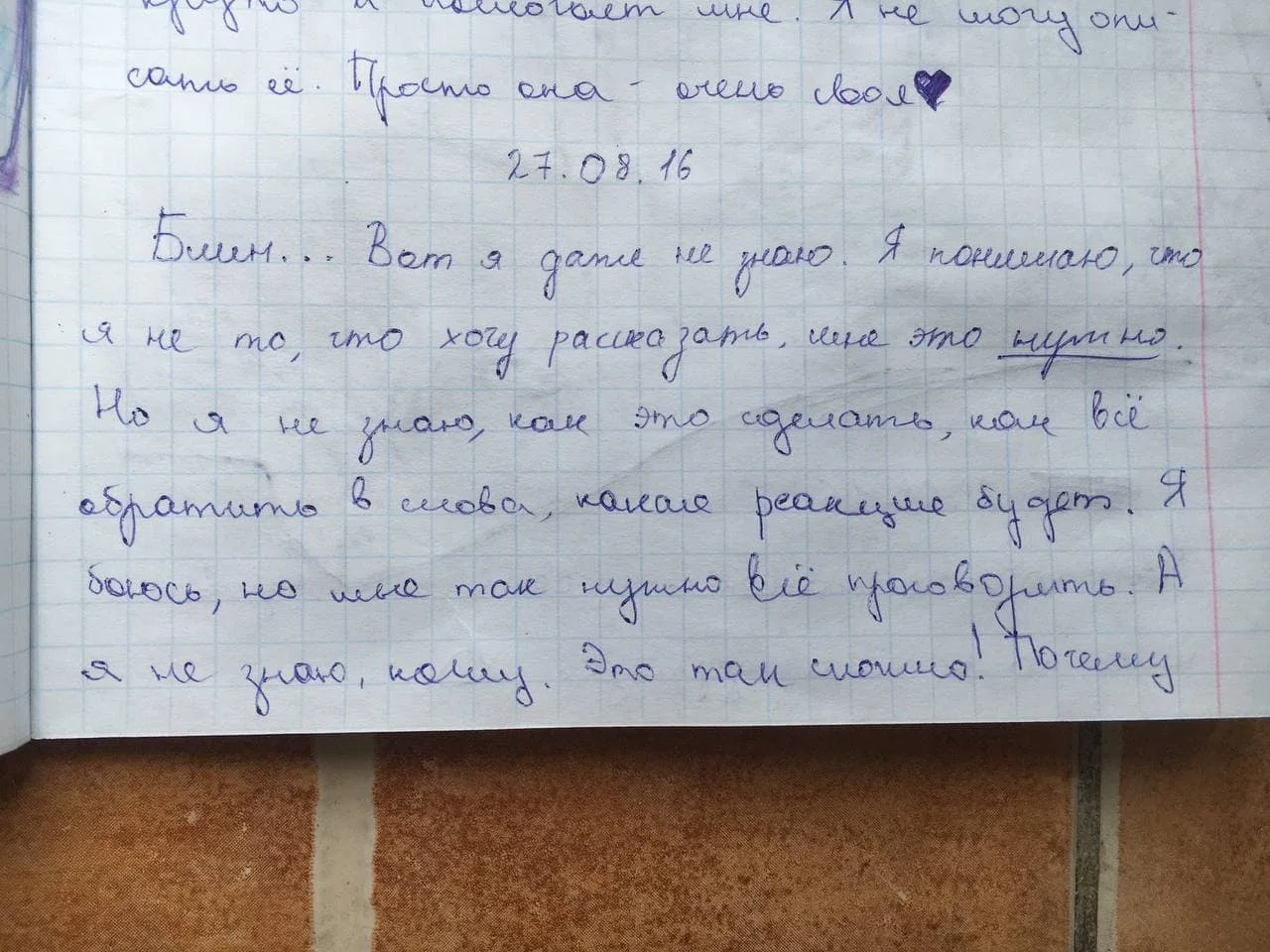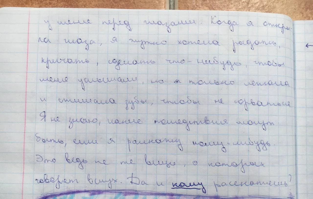 Я очень хотела кому-нибудь рассказать о том, что со мной происходило, и начала проговаривать эту историю в своей голове. Я составила фразы, заучила их, чтобы все рассказать. Каждую ночь я засыпала с мыслью о том, как буду это делать, а потом просыпалась и не понимала, кому я могу рассказать.
