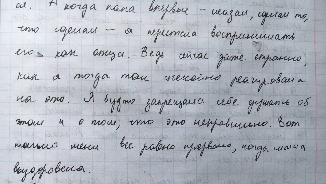 У меня в голове не было мысли о том, что происходит что-то ненормальное. Мама болеет раком — это грустно и тяжело. Папа пьет — это тоже грустно и тяжело. Но что меня дома кто-то домогается, насилует — такого у меня в голове не было. Не было для этого слов, я не понимала, что происходит. Я могла притащить его пьяного домой и тут же ответить кому-нибудь в чате, что у меня все хорошо.