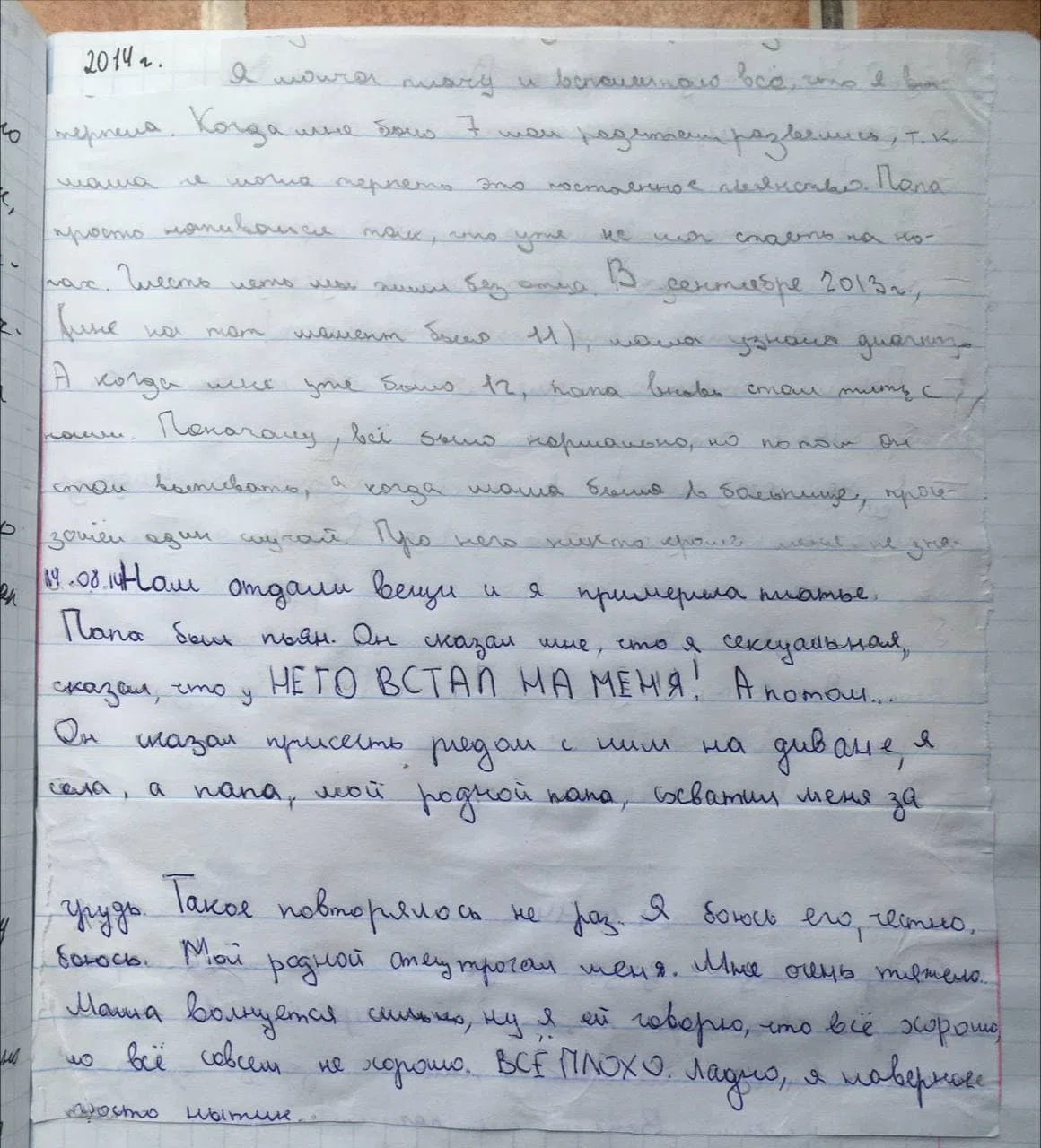 Все началось, когда для меня передали какие-то вещи. Папа сказал мне их примерить, как будто это показ мод. Я надела платье, оно было мне явно велико, но меня это не смущало. Мне двенадцать лет, у меня очень красивое платье, все хорошо. Он сказал присесть к нему на диван, я села, и он схватил меня двумя руками и прошептал мне в ухо, что я очень красивая, очень сексуальная — и что у него на меня стоит.