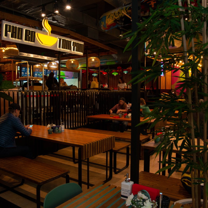 Азиатский фуд-холл на третьем этаже ТРК «Охта Молл» включает в себя пять корнеров, в которых подают блюда из Японии, Кореи, Вьетнама и других азиатских стран. Одним из корнеров управляет команда службы доставки корейской кухни Mr. Kim. Кроме того, в East Food можно попробовать супы фо бо и том-ям, поке и роллы, а также азиатские сладости — например, тайские банановые блинчики. Есть в пространстве и бар: там готовят шейки, чайные коктейли и домашние лимонады.