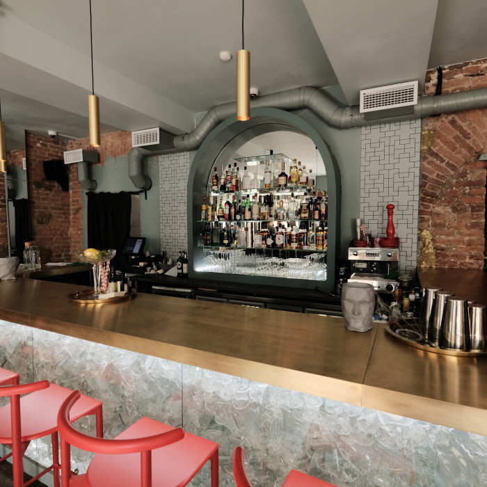 — [Бар] начинается с интерьера: в бывшем стекольном магазине барная стойка оформлена битым хрусталем, а на кирпичных стенах — узкие зеркала, которые визуально расширяют и без того просторный первый зал. Второй — более камерный, для приватных (нет, не танцев) бесед. Хотя танцы тоже можно — диджеи играют по пятницам и субботам.