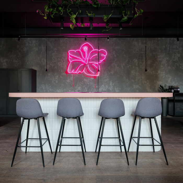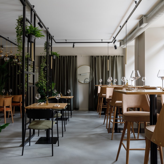 Интерьер винного ресторана на Инженерной улице выполнили в розово-серых тонах с использованием дерева, бетона и живых растений. На одной из стен можно найти неоновую лампу в виде гибискуса, рядом с ней находится коммунальный стол со столешницей из розового бетона. В винной карте собрали органические и биодинамические вина, а в меню можно найти севиче из лосося с нектарином, полбу с индейкой, баскский чизкейк, панкейки с соленой карамелью и другие позиции. Хлеб и пасту в заведении делают сами.