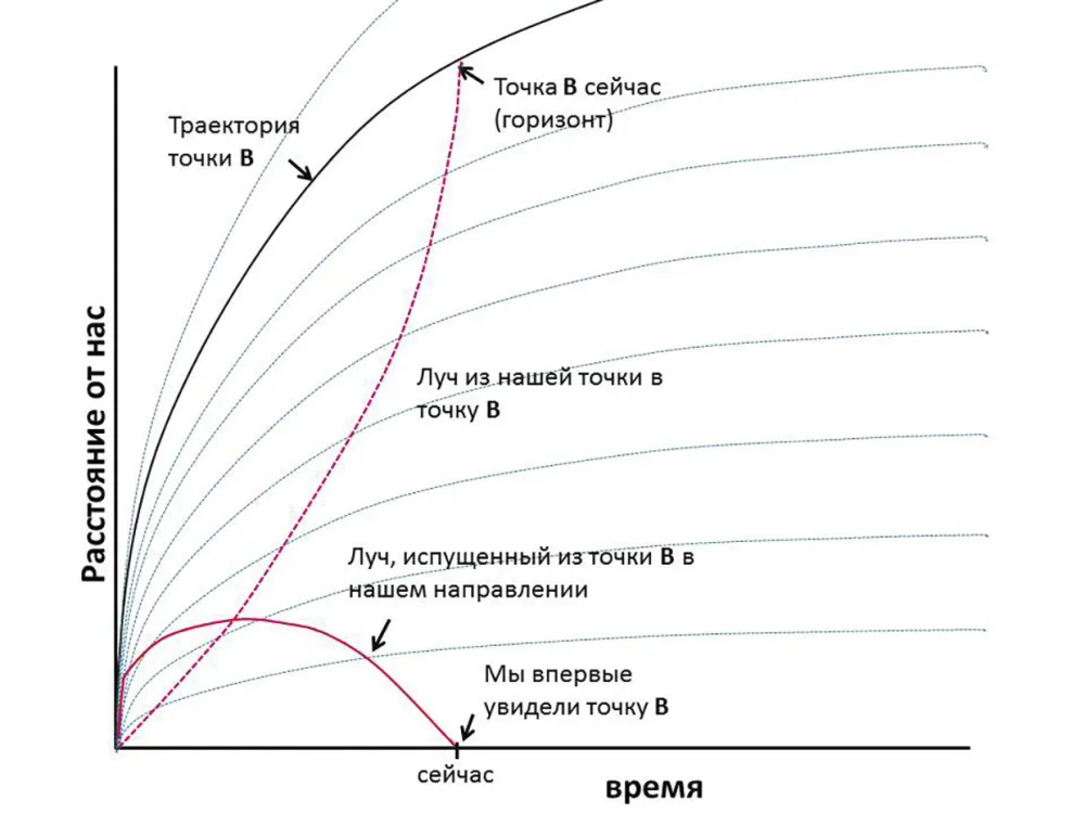 Горизонт нашей Вселенной в настоящий момент находится в 46 млрд световых лет от нас при возрасте Вселенной 13,8 млрд лет. Ничего удивительного: точка В в молодой Вселенной убегала от нашей точки А гораздо быстрей света. Более того, фотон, испущенный из точки В в сторону А, тоже удалялся от точки А быстрей света. Ситуацию приблизительно иллюстрирует рисунок внизу.