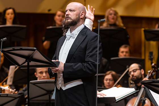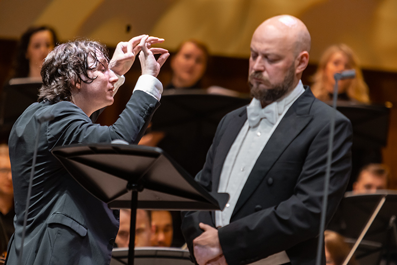 © Ира Полярная / «Опера априори» Этот образ с вердиевским размахом воплотил на сцене «Зарядья» статусный мариинский баритон Владислав Сулимский. Среди его партнеров особенно порадовали самаркандский тенор Бехзод Давронов и казанская сопрано Альбина Латипова (оба — в труппе Большого театра). Уверенная немецкая меццо-сопрано Мари Зайдлер придавала исполнению аутентичный шик, хотя нельзя сказать, что музыкальный язык оратории казался чужим остальным ее исполнителям. Маэстро Максим Емельянычев прекрасно справился с тем, чтобы этого не допустить. Тем более что в его распоряжении были поднаторевший в раннеромантической музыке оркестр Musica Viva, украшенный по такому случаю натуральными валторнами и трубами, и главный герой вечера — чудесный хор Intrada, благодаря которому религиозное чувство и изысканная красивость объединились без какого бы то ни было конфликта.