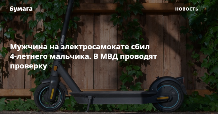 Полиция проводит проверку после того, как мужчина наехал на 4-летнего мальчика на электросамокате в парке 40-летия ВЛКСМ в Колпинском районе. Об этом «Бумаге» сообщили в ГУ МВД по Петербургу и Ленобласти.