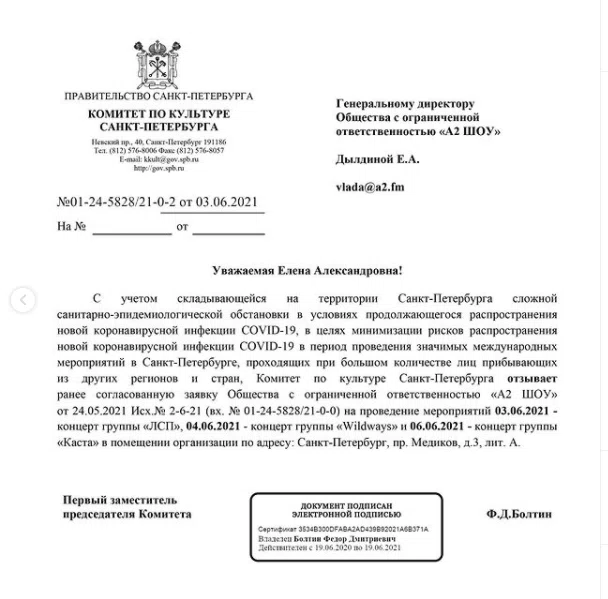 В Петербурге отменили концерты «ЛСП», Wildways и «Касты», которые должны были пройти в клубе А2 Green Concert 3,4 и 6 июня соответственно. Документ, который отзывает разрешение на мероприятия, опубликован в инстаграмме «Касты».