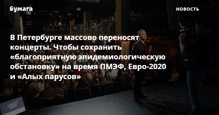 Власти Петербурга переносят концерты из-за крупных городских мероприятий: ПМЭФ, Евро-2020 и «Алых парусов», сообщили «Бумаге» в пресс-службе комитета по культуре.