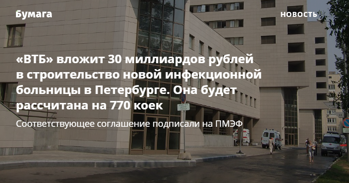 В Петербурге построят новую инфекционную больницу на 770 коек. Это один из пунктов соглашения, которое 3 июня на ПМЭФ подписали правительство города и ООО «ВТБ Инфраструктурный Холдинг» (группа «ВТБ»), сообщает пресс-служба компании.