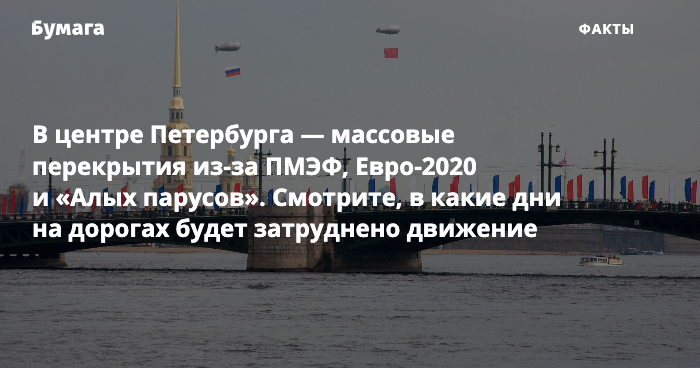 Петербург ждет череда перекрытий в течение всего июня. Из-за Петербургского международного экономического форума, Евро-2020 и праздника выпускников «Алые паруса» в городе ограничат движение по десяткам улиц. Некоторые дороги сделают односторонними или сузят.