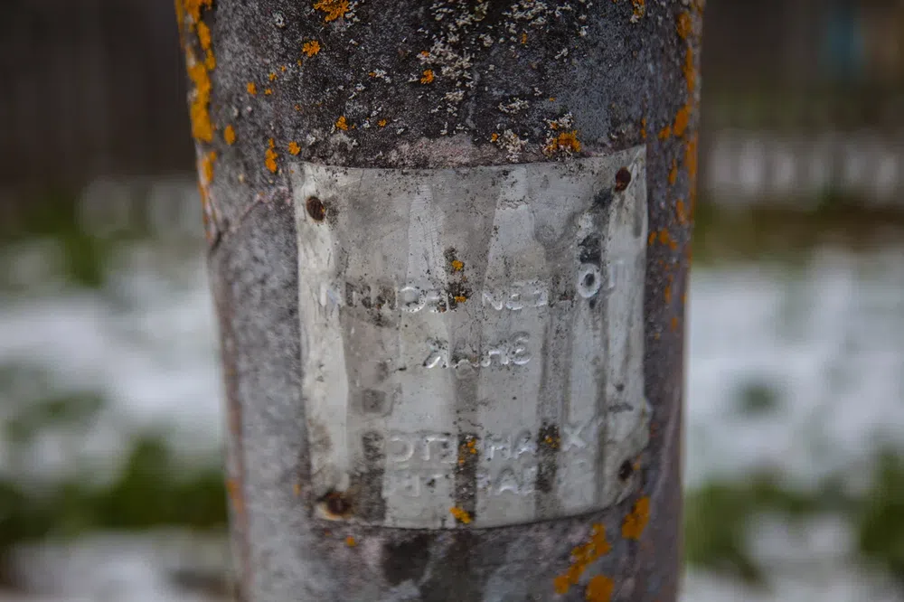 Напротив остановки автобуса (здесь ходит рейсовый автобус) — желтый геодезический столбик «Охраняется государством» — память об изыскательских работах, которые здесь активно велись в 2007 году.