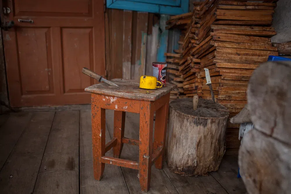 Кукшиново встречает нас снегом. И заброшенной длинной улицей, ведущей от центральной улицы влево. Все как и в Красной Поляне: заброшенные, разрушенные или пустые, на замках, дома. Дом в тупике оказывается жилым: в окнах мы замечаем рассаду и резиновые советские игрушки. На пороге — нож, воткнутый в бревно. Здесь живет Наталья — но сегодня ее нет дома.
