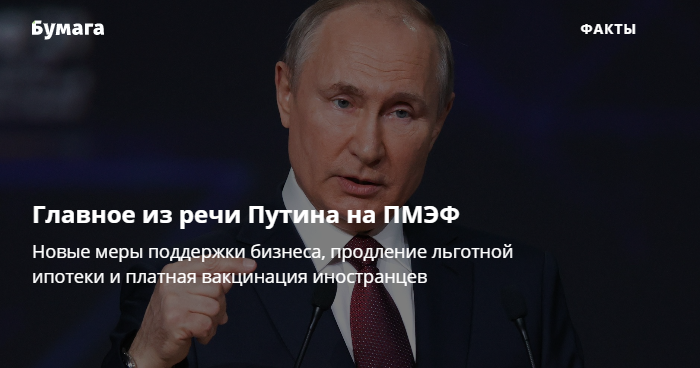 Днем 4 июня Владимир Путин выступил на пленарном заседании Петербургского международного экономического форума. «Бумага» рассказывает о главных предложениях президента — от продления льготной ипотеки до платной вакцинации иностранцев.