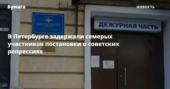 В Петербурге задержали семерых членов труппы театрального проекта «Форум-театр» во время репетиции спектакля про советские репрессии. Об этом первым сообщил телеграм-канал «ПЬЯТNIЦА», позднее информацию «ОВД-Инфо» подтвердил супруг одной из задержанных Булат Гильманов.