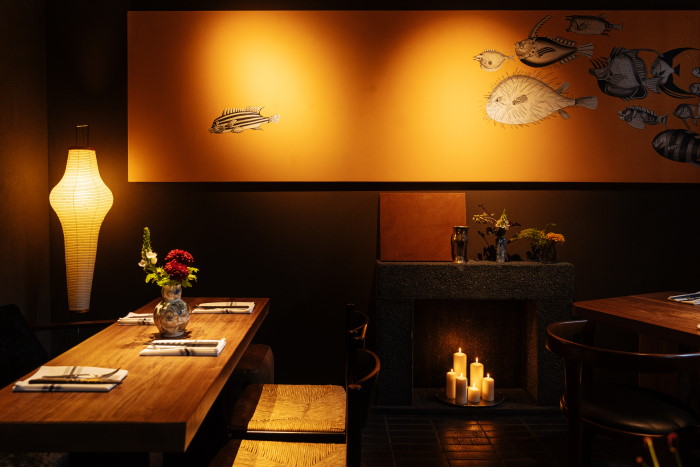 Интерьер заведения разработал дизайнер Алексей Пенюк. В зале выставили мебель и другие детали интерьера из Европы и США — например, стулья от Silvio Coppola и подвесные светильники от бренда Isamo Noguchi. Внимание уделили и посуде: тарелки и палочки привезли из Японии.