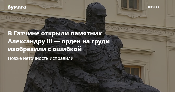В субботу, 5 июня, в Гатчине открыли памятник Александру III. В церемонии участвовал Владимир Путин — он возложил цветы к постаменту и похвалил авторов проекта, назвав работу «реальным успехом». Позже в соцсетях раскритиковали скульптуру из-за исторической неточности — орден на груди изобразили с ошибкой.