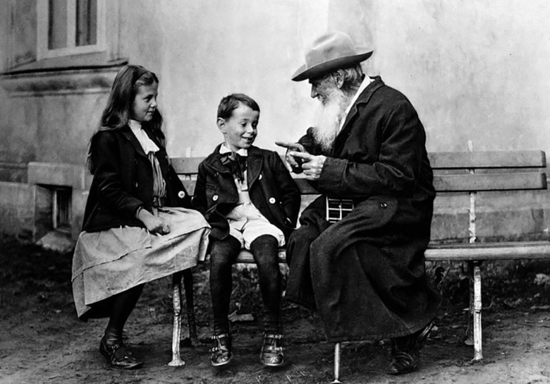 Л. Н. Толстой рассказывает сказку об огурце внукам Ильюше и Соне. Софья Андреевна Толстая в будущем — последняя жена Сергея Есенина.