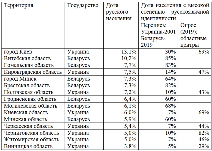 Как видно, примерно 1,4 млн русских живет в Белоруссии и в центральной Украине — Поднепровье, центральная Подолия, восток Волыни, где они составляют обычно не более 10% населения. Но при этом они в основном живут в городах и существуют в среде, где русский язык либо абсолютно преобладает при использовании в быту, либо в разы и даже на порядок превышает долю русских в населении. Как видно, подобная ситуация особенно значима для областных центров на Украине.