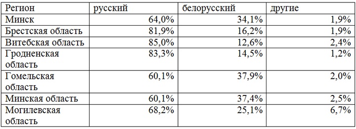 Это отличие (за исключением города Минска и Гродненской области, где чувствуется белорусское языковое возрождение) формируется в основном за счет села. Так, если в Витебской и Гомельской области в сельской местности на белорусском говорит только от четверти до трети населения, то в Минской области (особенно на северо-западе) уже почти половина. А в преимущественно католической Гродненской области 63% сельчан общаются на белорусском.