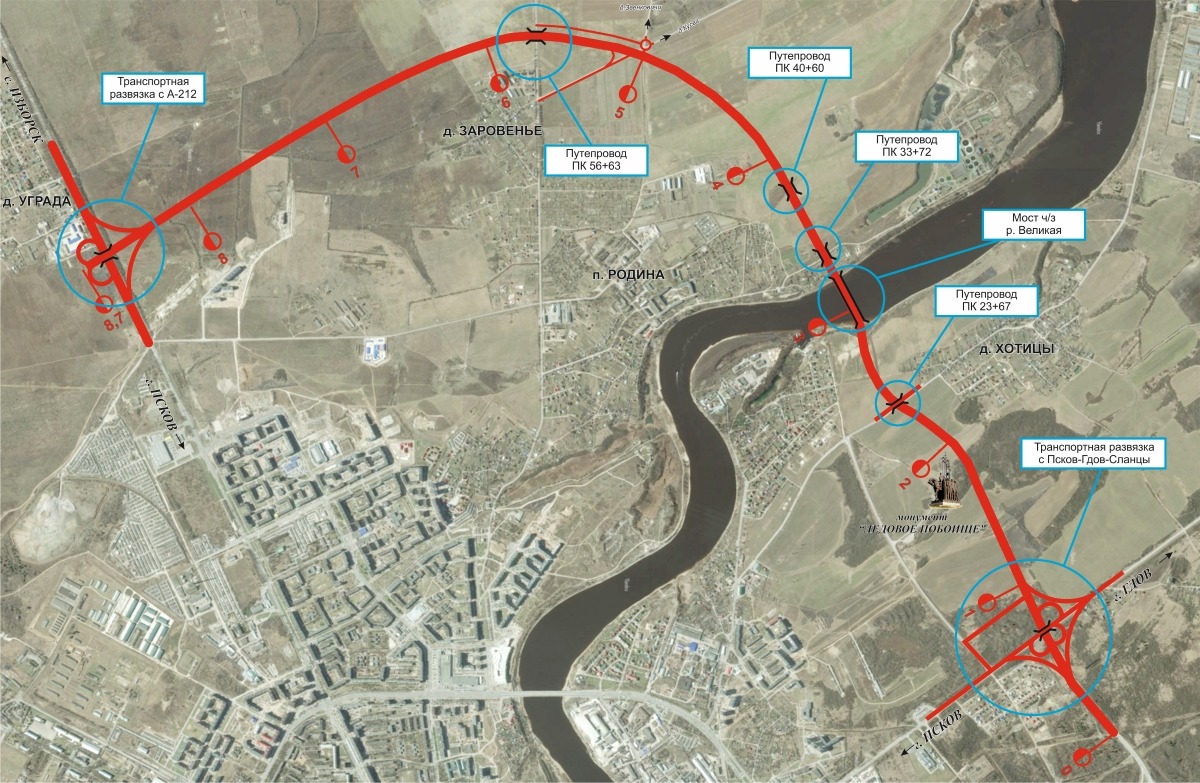 Подрядчику предстоит построить дорогу II категории с мостом через реку Великую, транспортной развязкой на пересечении с дорогой А-212, тремя путепроводами (на пересечении с автодорогой Псков – Писковичи - Муровицы, через улицу Набережную в деревне Родина и дорогу Заровенье – Кусва) и технологическим проходом для прогона скота.