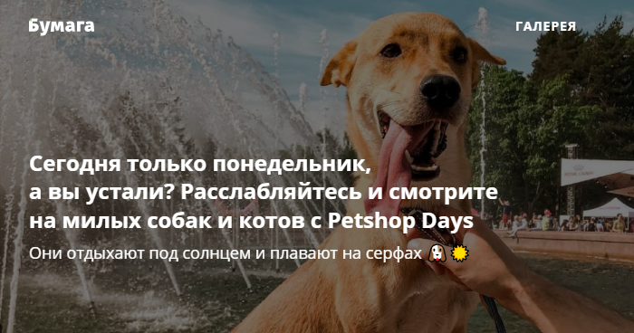 В выходные, 5 и 6 июня, на Крестовском острове в Петербурге прошел фестиваль домашних питомцев Petshop Days. Десятки собак участвовали в спортивных играх, плавали на серфах и просто лежали под жаркими лучами солнца. Им пели Клава Кока, Cream Soda, «ЛАУД» и Тося Чайкина (а еще читал лекцию Николай Дроздов).