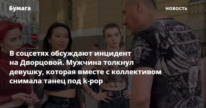 Петербурженка Олеся Ли рассказала об инциденте, который произошел с ней на Дворцовой площади. Она вместе с другими девушками записывала на видео танец под k-pop, когда к ним подошел неизвестный мужчина. Сначала он стоял на заднем плане, держа в руках голубей, затем стал кричать, в том числе используя мат. В итоге он толкнул одну из участниц.