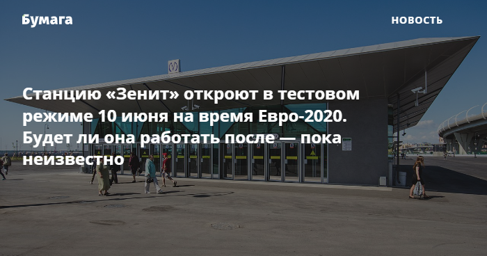 Станцию метро «Зенит» откроют в тестовом режиме перед матчами Евро-2020, которые пройдут в Петербурге, сообщили «Бумаге» в пресс-службе комитета по транспорту.